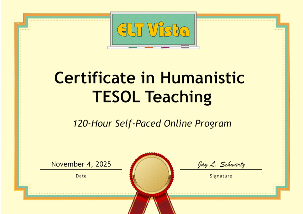 We now offer the ELT Vista Certificate in Humanistic TESOL Teaching, a fully online, self-paced program designed for educators who wish to deepen their understanding of humanistic methodology, reflective teaching, and teacher self-actualization. This course integrates practical methodology with psychological insight and personal development, and it serves as the central training program within the ELT Vista ecosystem.